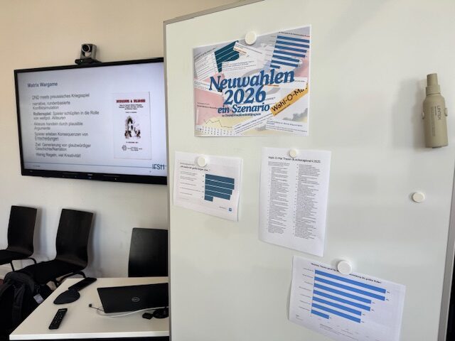 We confronted our students with a semi-fictitious scenario of a coalition crisis within the German government and a sudden election in the summer of 2026. The geopolitical context was roughly that of 2025, with the war in Ukraine ongoing, economic decline in Germany, unreliable transatlantic partnerships, and growing relevance of artificial intelligence (AI).